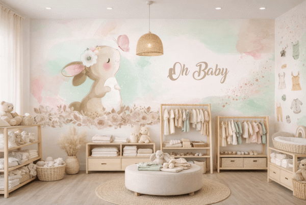 Vinilos ilustrados para boutique infantil – Diseño mural