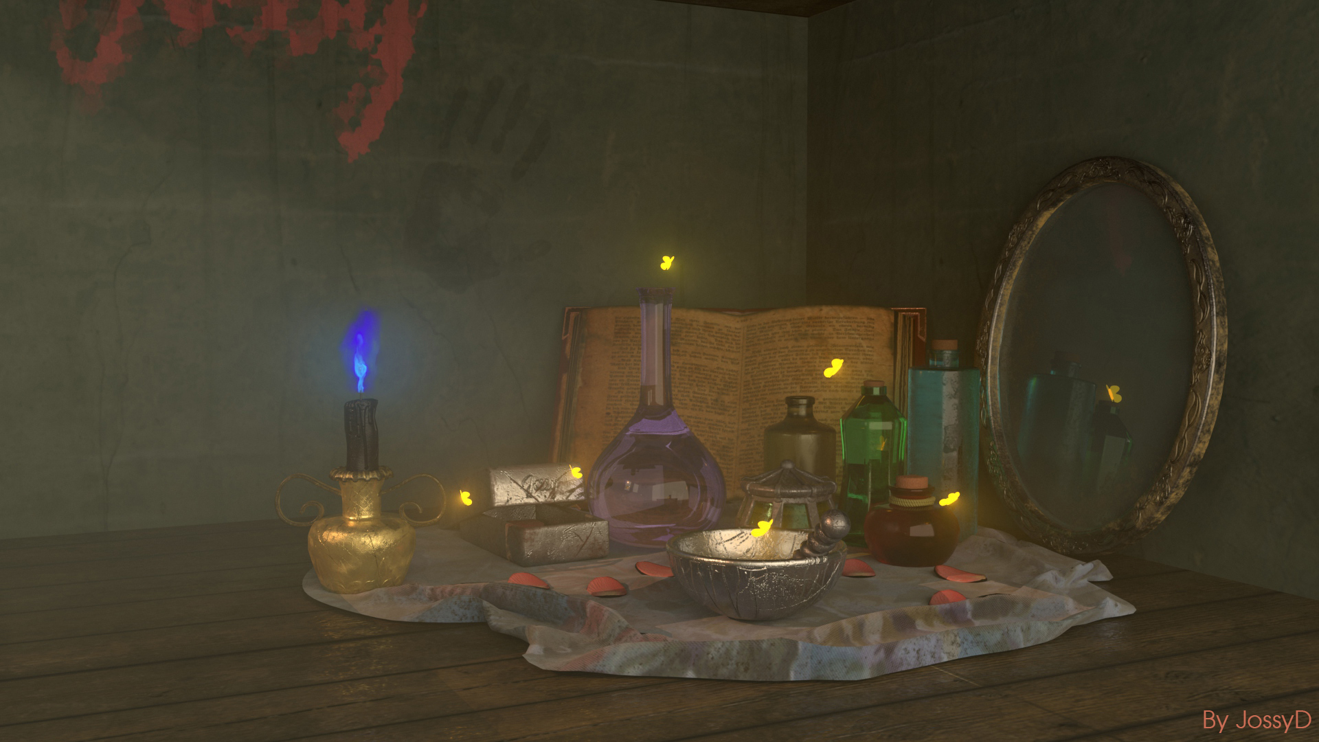 Escenario 3D inspirado en un concept art, reinterpretado para crear una atmósfera íntima y misteriosa. Modelado, texturizado e iluminación realizados desde cero, con especial atención al detalle, los materiales y la luz ambiental para reforzar la sensación de espacio, historia y simbolismo.